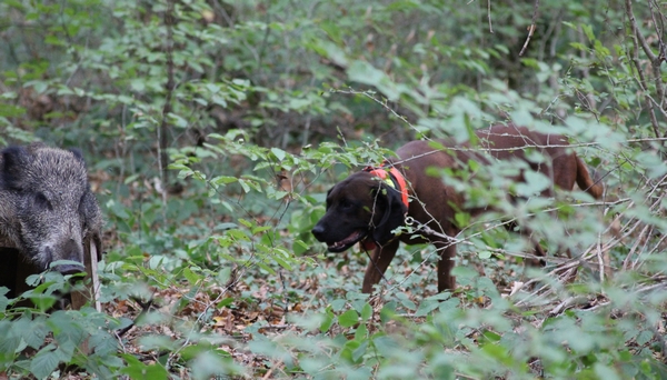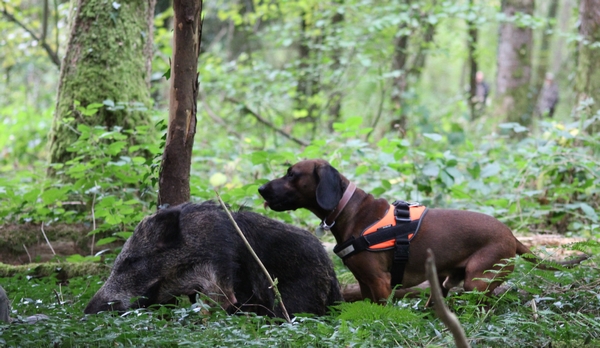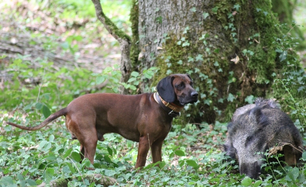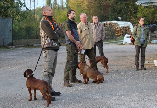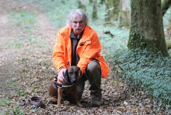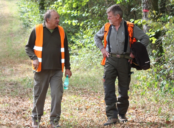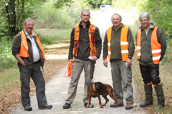 Les 4 chiens de Rouge de Bavière et le chien de Rouge du Hanovre avaient été répartis en 2 groupes afin de limiter la durée de notre présence sur le terrain et de ne pas perturber les activités cynégétiques qui devaient s’y tenir l’après-midi. Grace à l’excellente organisation de Patrick Gavoille et de son équipe qui nous ont accueilli avec un enthousiasme et une bonne humeur à chaque fois renouvelés, les travaux ont été menés dans un enchaînement parfait. Les conditions météorologiques étaient particulièrement agréables, la légère fraîcheur matinale s’étant maintenue dans les sous bois, maintenant une bonne qualité de voie malgré la sécheresse ambiante.