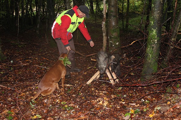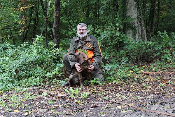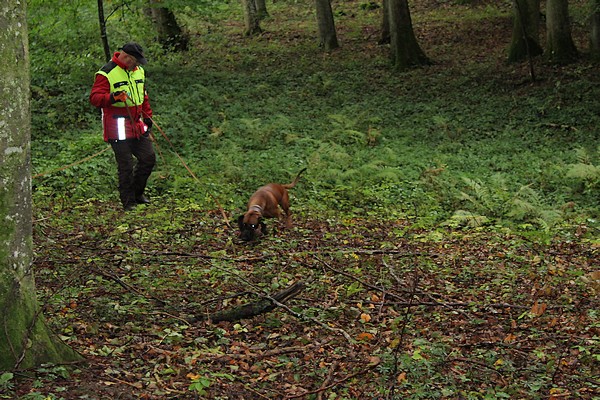 Hors épreuve, car n’ayant pas l’âge requis, un jeune chien de Rouge de Bavière en formation a pu pister et s’exercer avec son conducteur sur une piste de réserve, prenant ainsi la mesure des points faibles à travailler.