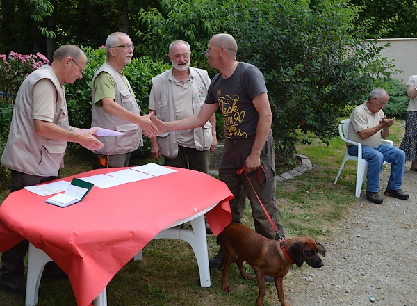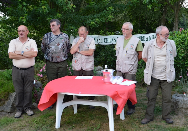 Nous avons accueilli 4 chiens de Rouge de Bavière et 1 chien de Rouge du Hanovre. La météo annonçait de fortes chaleurs, l’horaire du contrôle vétérinaire et du mot d’accueil ainsi que le tirage au sort des pistes a été avancé.