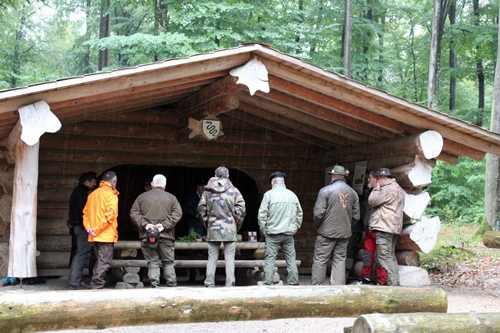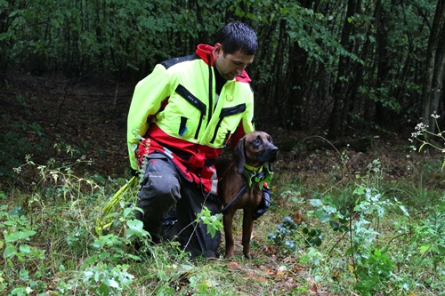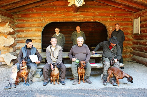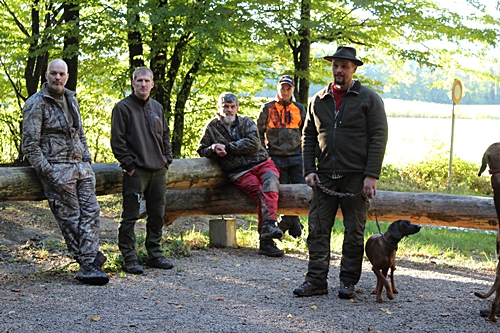 Le groupe composé de 4 chiens de Rouge de Bavière s’est retrouvé le matin à 8h à la « Waldfest », et a particulièrement apprécié de trouver abri sous la fuste (maison en rondins empilés, aux murs et à la charpente faits de fûts d’arbres bruts) tant la pluie était ardente… La pose des pistes avait néanmoins pu se dérouler par temps sec, et les précipitations n’avaient démarré que tard dans la nuit.